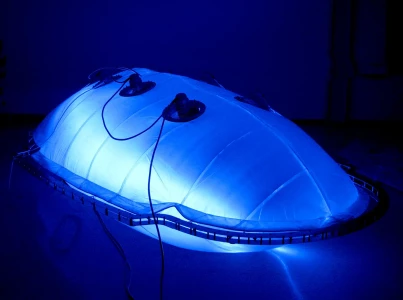 Organisch anmutende Aktions- und Ruhephasen der technisch-anonym gefertigten Objekte erzeugen eine meditative Atmosphäre, verstärkt durch eine LED- und Schwarzlicht-Beleuchtung, die den Raum in blaues Licht taucht.
